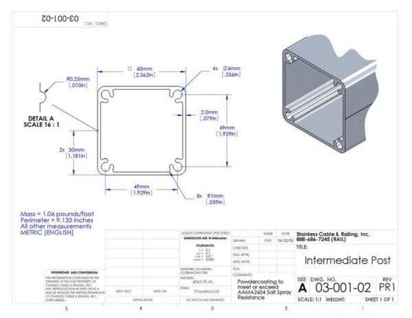 FASCIA MOUNT INTERMEDIATE POSTS are used between the TERMINAL POSTS and are spaced approximately every 4′. The wire rope passes through without loading the post. Each post is manufactured from 6063 T6 aluminum providing the strongest cable rail system available.