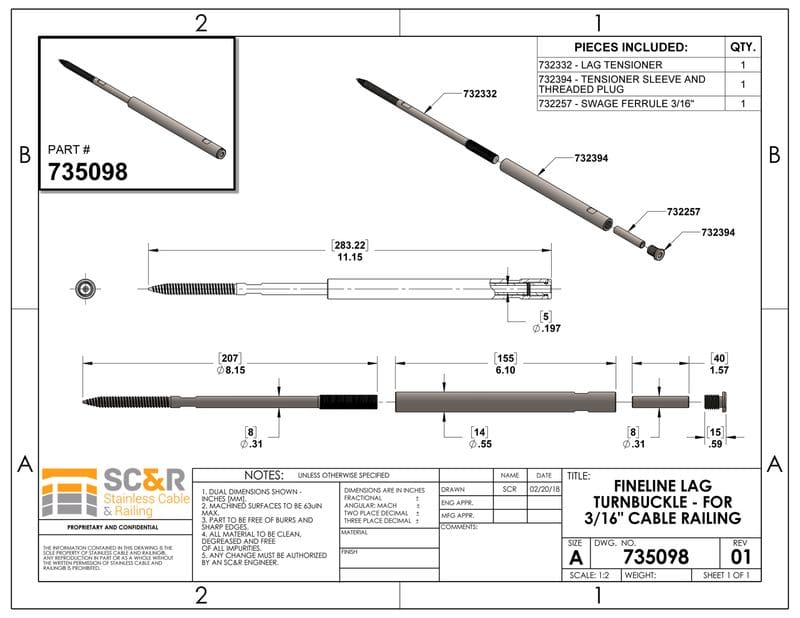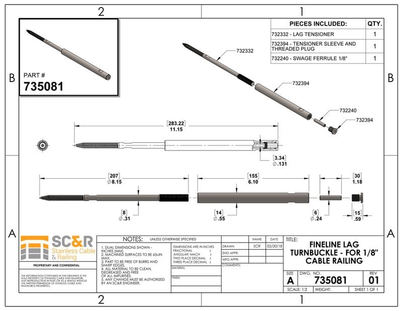 Install FineLine™ TURNBUCKLES for decades of maintenance free service! The FineLine™ LAG TURNBUCKLE is a compact, architectural turnbuckle manufactured from 316 Stainless Steel that represents the best in engineered cable railings. It has no exposed threads and the SWAGING SLEEVE fitting is internal within the turnbuckle body. The FineLine™ LAG TURNBUCKLE works well for straight cable runs with wood posts (Min. 4″x4″).