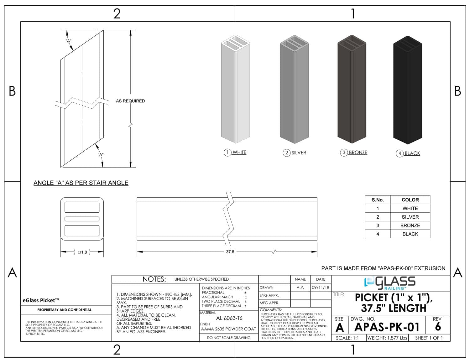 AL 6061-T6 Alloy AAMA 2605 Powder Coat Black, Bronze, Silver, White 1″” Square 37.5″” for 36″” or 42″” Rail Systems 10-year (5-year Florida)