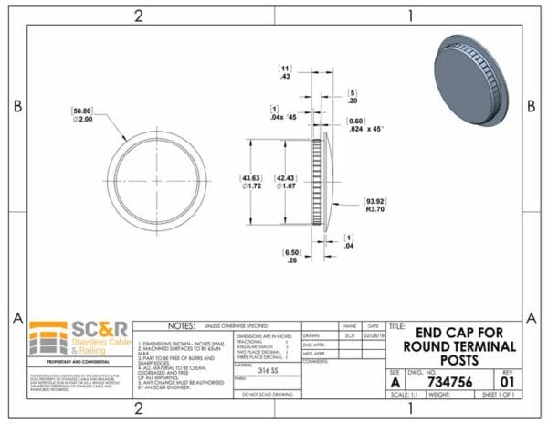 End Cap for 2in OD Round Stainless Steel terminal posts.