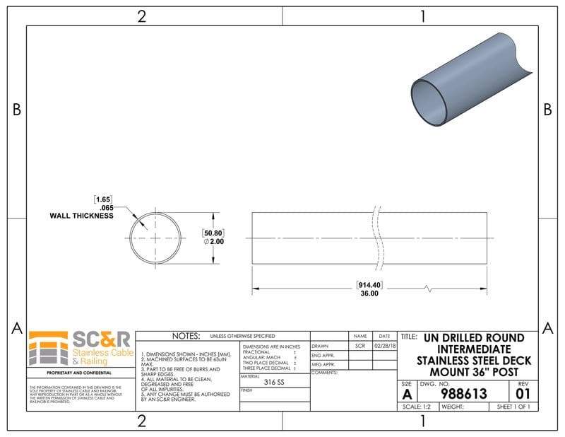 - Dimensions: 2in OD with 1.6mm wall thickness. For Cable Railing Systems at 36in Rail Height