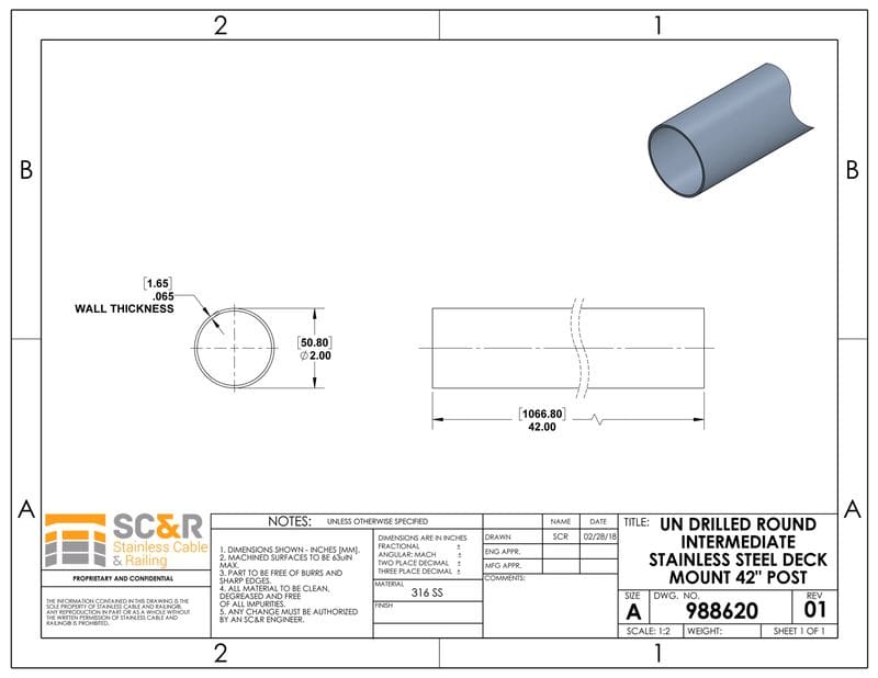 - Dimensions: 2in OD with 1.6mm wall thickness. For Cable Railing Systems at 42in Rail Height