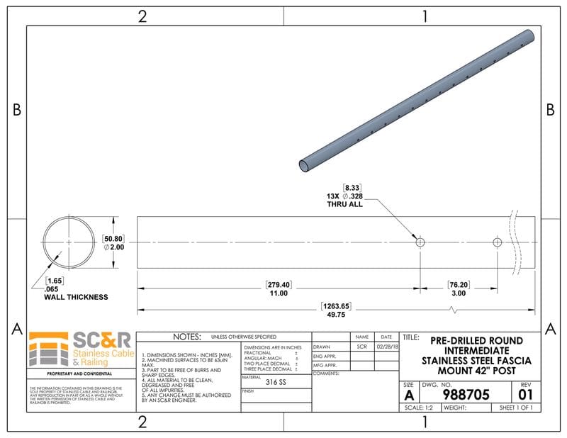 - Dimensions: 2in OD with 1.6mm wall thickness. For Cable Railing Systems at 42in Rail Height