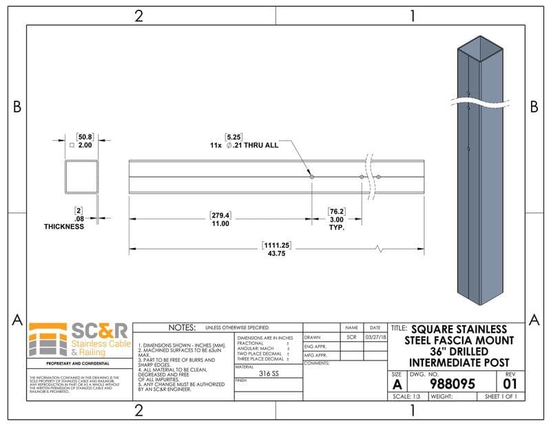 Square Stainless Steel Fascia Mount 36″ Drilled Intermediate Post