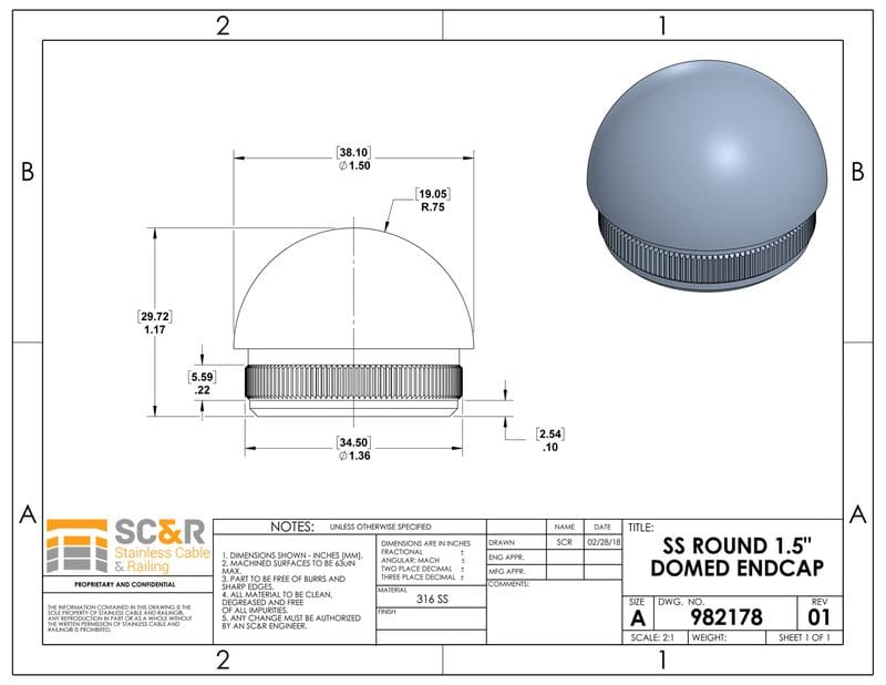This domed cap seals exposed ends of a Stainless Steel Round Handrail with a distinctly rounded design.