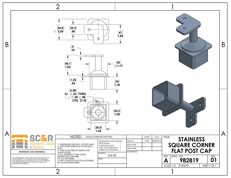 Use these post caps to attach a flat toprail to your square stainless steel terminal corner posts. Order one for each single-post corner of your railing system.
