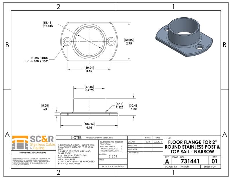 Floor / Wall Flange for 2″ Round Stainless Post & Top Rail – Narrow