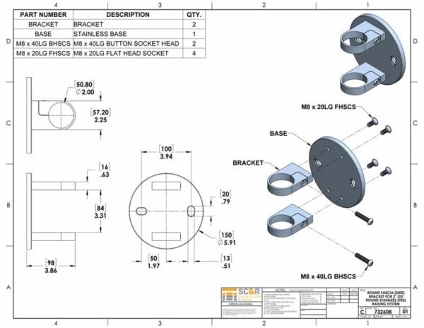 Round Fascia (Side) Bracket for 2in OD Round Stainless Steel Railing System