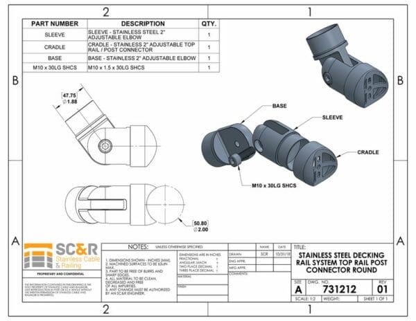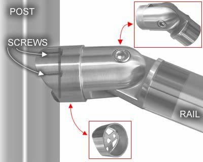 The adjustable stainless steel top rail connector is used for elevation changes, such as stairs, accommodating angles up to 45 degrees. Item ships quickly with instructions and arrives pre-assembled with connecting bolt.
