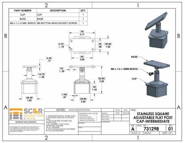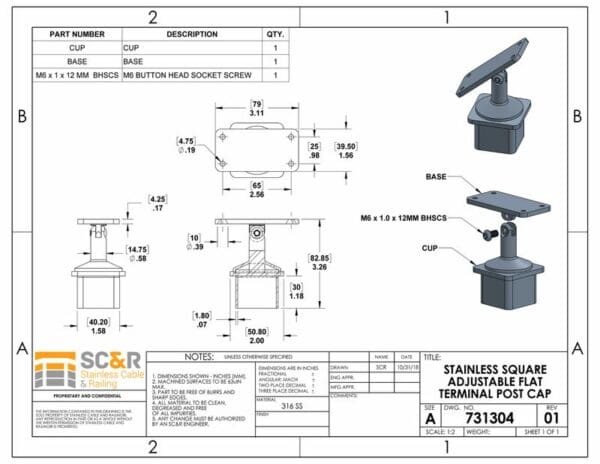 Attach a flat toprail to square stainless steel posts through stair sections using these adjustable post caps. Make sure to order the right number of intermediate and terminal caps for intermediate and terminal posts in the angled areas of your run.