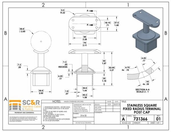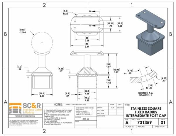 This post cap attaches your square stainless posts to a Round Stainless Toprail. Order enough intermediate and terminal caps for each intermediate and terminal non-stair post in your railing system.