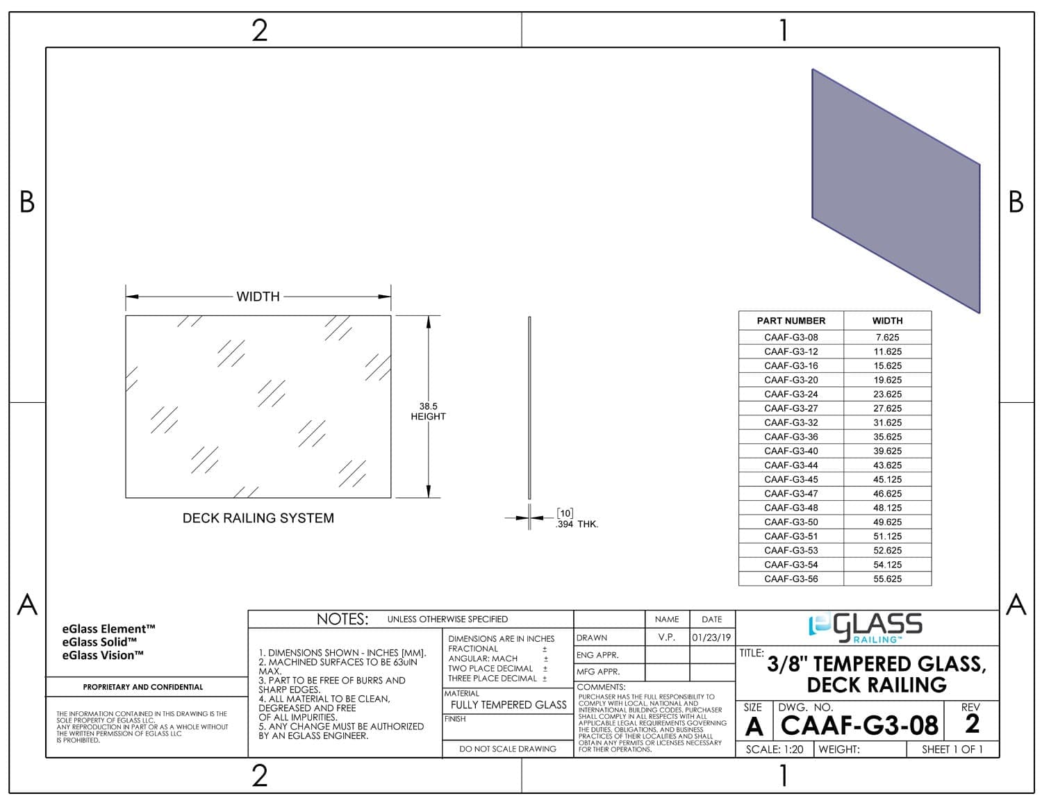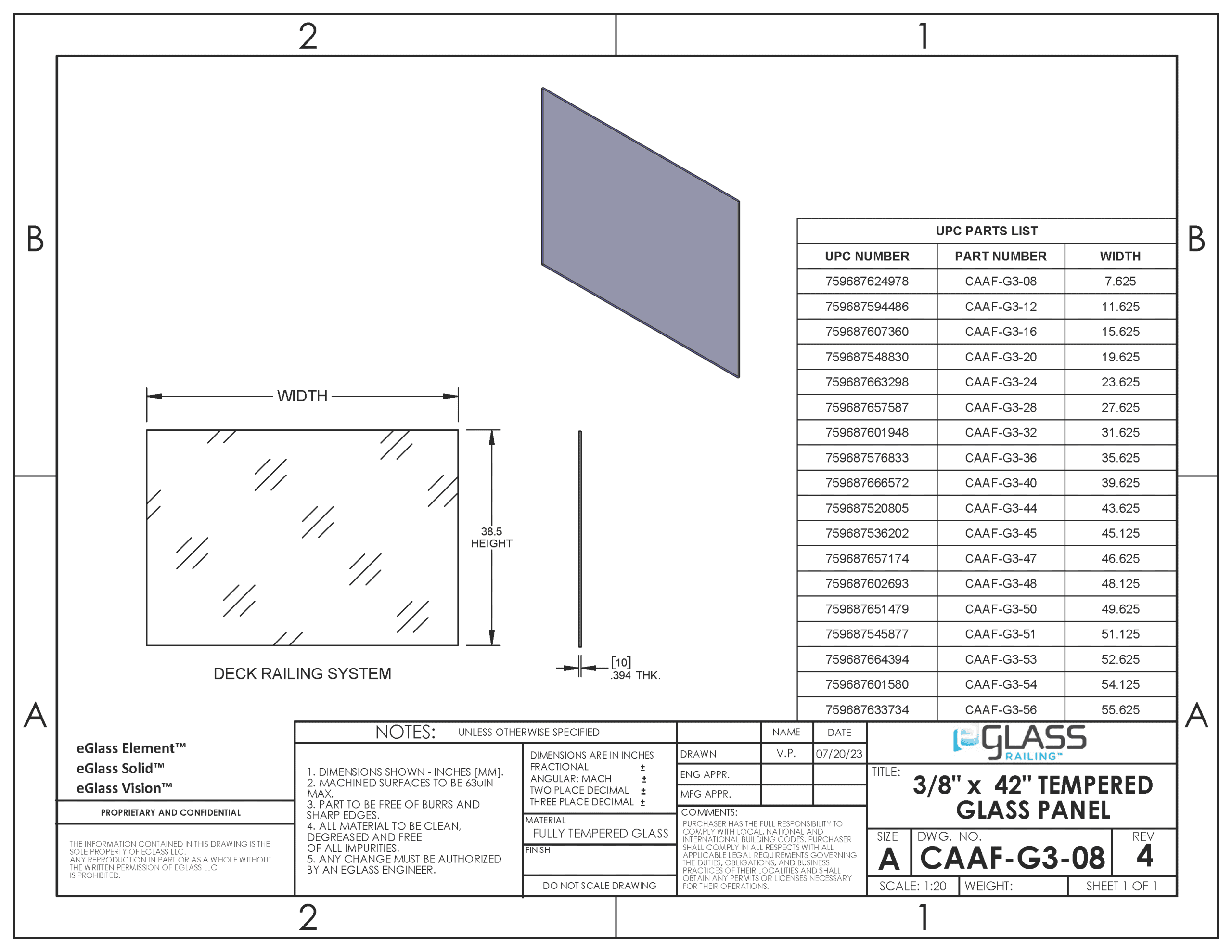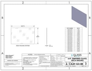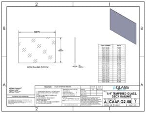 Order tempered glass infill for your 42-inch glass railing system. Select the variation that matches post height, shoe, clamps, and top rail on your approved drawings.