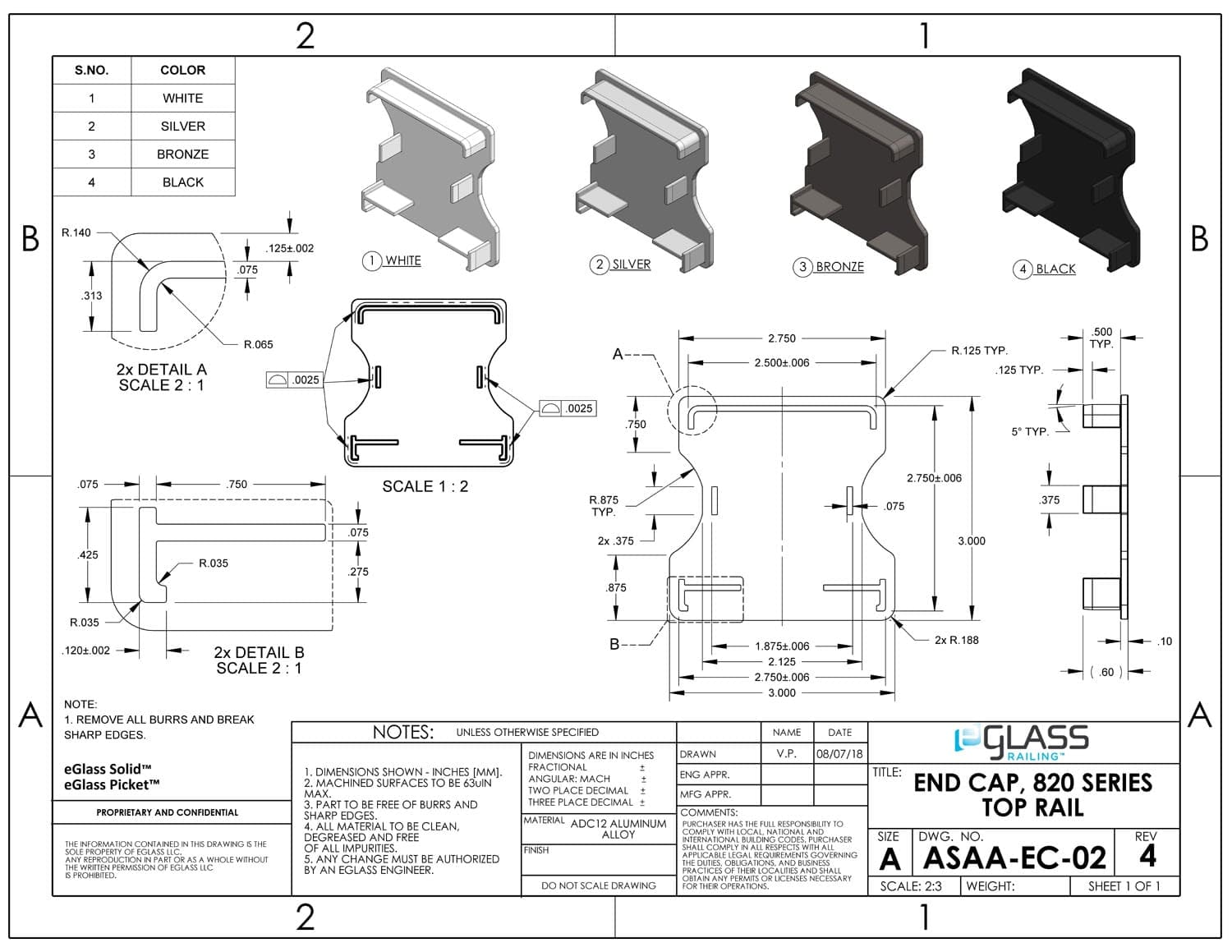 These caps are used to seal the exposed end(s) of an 820 Series Top Rail for safety and aesthetics.