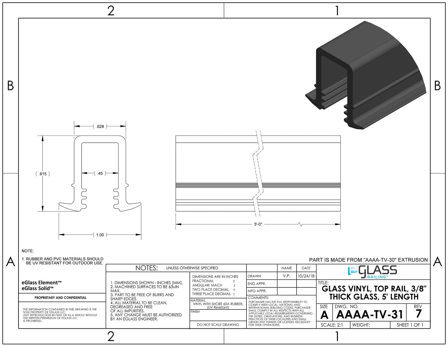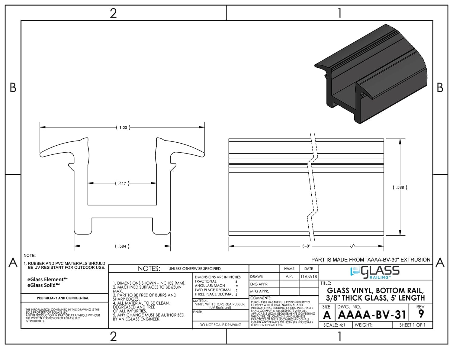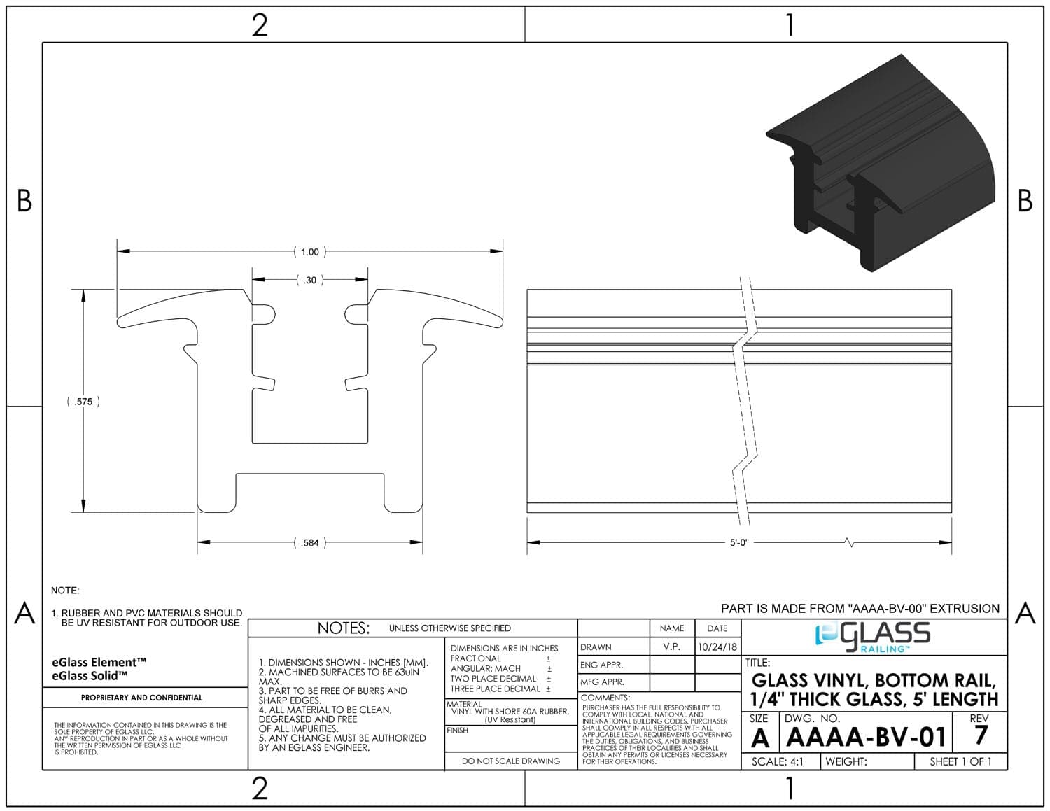 | Vinyl with Shore 60A Rubber (UV Resistant) | Black | 0.54″ x 1″ x 5′ | 10-year (5-year Florida) |
